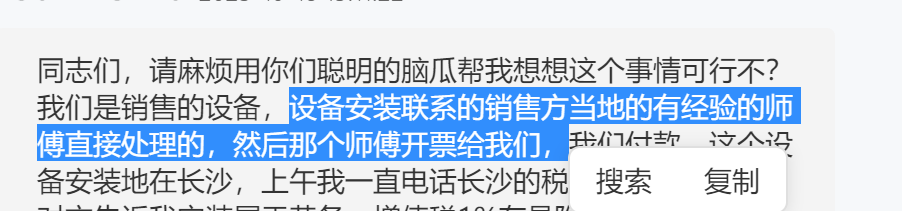 同志们,请麻烦用你们聪明的脑瓜帮我想想这个事情可行不?我们是销售的设备,设备安装联系的销售方当地的有经验的师傅直接处理的,然后那个师傅开票给我们,我们付款。这个设备安装地在长沙,上午我一直电话长沙的税务局问怎么开票,对方告诉我安装属于劳务,增值税1%在是附加税,然后购买方要代扣代缴20%个税。然后我在网页上面找到一个写着税收优惠园区能解决个人开票问题。我就联系了对方,对方告诉我需要开票个人提供:开票信息+合同+流水+注册湖南税务,综合的费用开票额*3% 然后我说个人开票不是一定要在项目所在地开