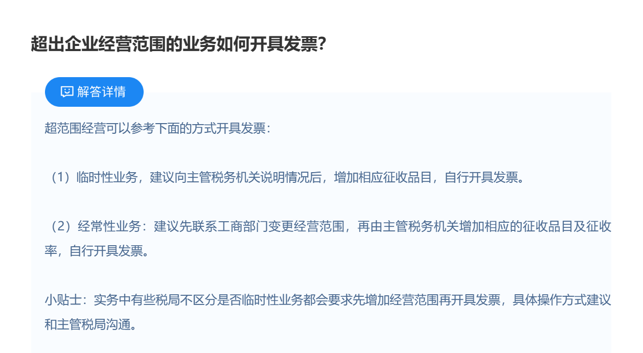 超出营业执照上的经营范围,也应当据实开具发票,考虑到征管口径,开具前可以先和主管局沟通。