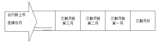 (三)某一期货合约上市运行阶段时间段的划分方法(举例说明): 如Cu0305,其运行阶段是从2002年5月16日起至2003年5月15日止,其中: 2002年5月16日为该合约新上市挂牌之日、2003年5月15日为最后交易日、2003年5月14日为最后交易日前一个交易日,2003年5月13日为最后交易日前二个交易日,2003年5月为交割月份、2003年4月为交割月前第一月、2003年3月为交割月前第二月、2003年2月为交割月前第三月。示意图如下: