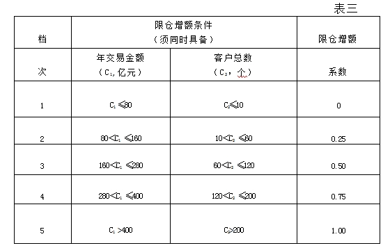 (三)业务增数:是经纪会员限仓总额中可依业务经营情况作变动的部分;以年交易金额80亿元、10个客户为底数,在此基础上,设定若干档次,分别规定各档次限仓增额系数须同时相应达到的年交易金额和客户总数水平。每一档次可以增加的限仓数额为基数乘以该档次的一定系数。业务增数的最大值与基数相等。