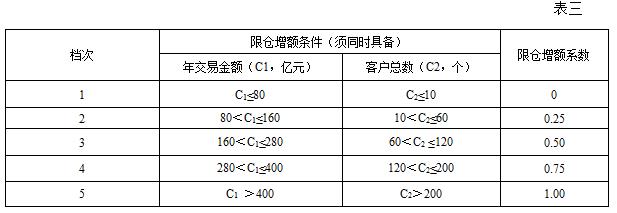 (三)业务增数:是经纪会员限仓总额中可依业务经营情况作变动的部分;以年交易金额80亿元、10个客户为底数,在此基础上,设定若干档次,分别规定各档次限仓增额系数须同时相应达到的年交易金额和客户总数水平。每一档次可以增加的限仓数额为基数乘以该档次的一定系数。业务增数的最大值与基数相等。