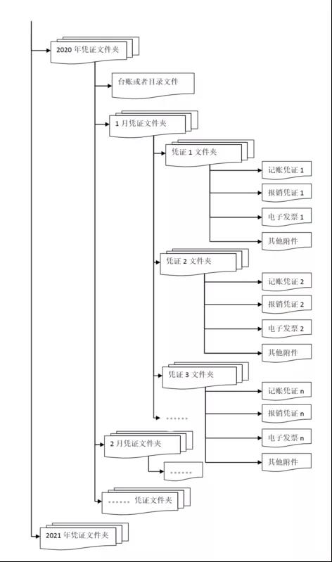 无电子档案管理系统的单位,如实施了会计信息系统,与电子发票相关的记账凭证、报销凭证等已全部实现电子化,可将电子发票与相关的记账凭证、报销凭证等移交会计档案管理人员保存,编制档号,存储结构建议采取下图所示方式: