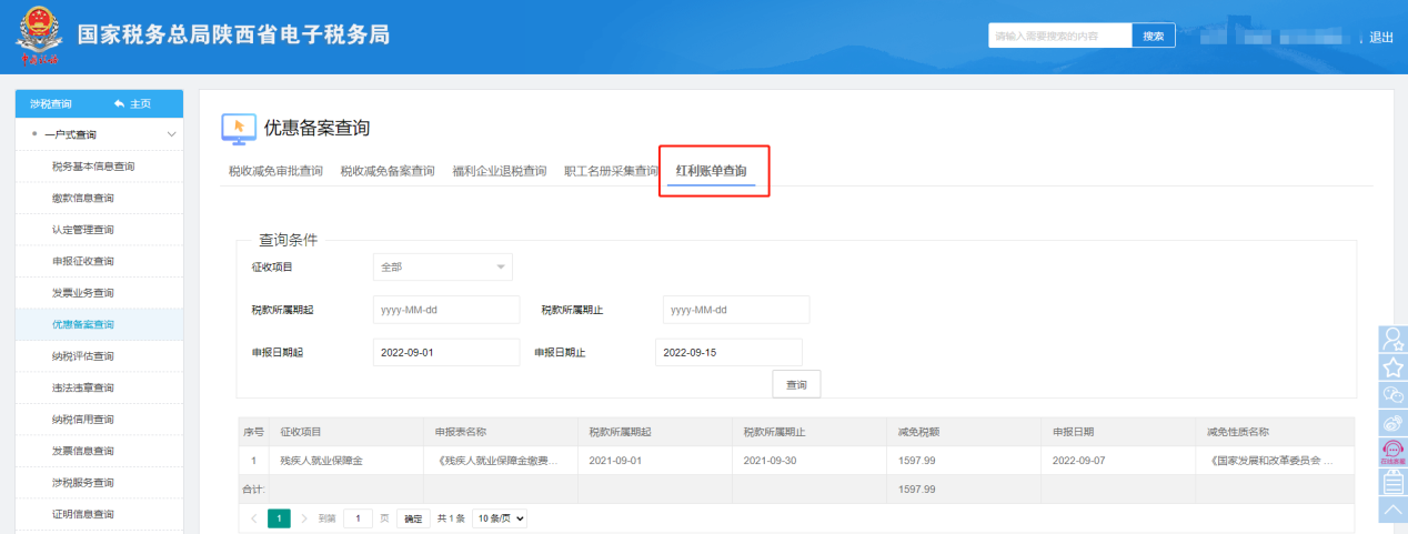 点击进入【我要查询】-【一户式查询】-【优惠备案查询】-【红利账单查询】进行查询即可。