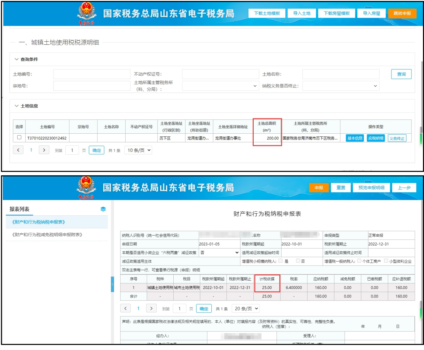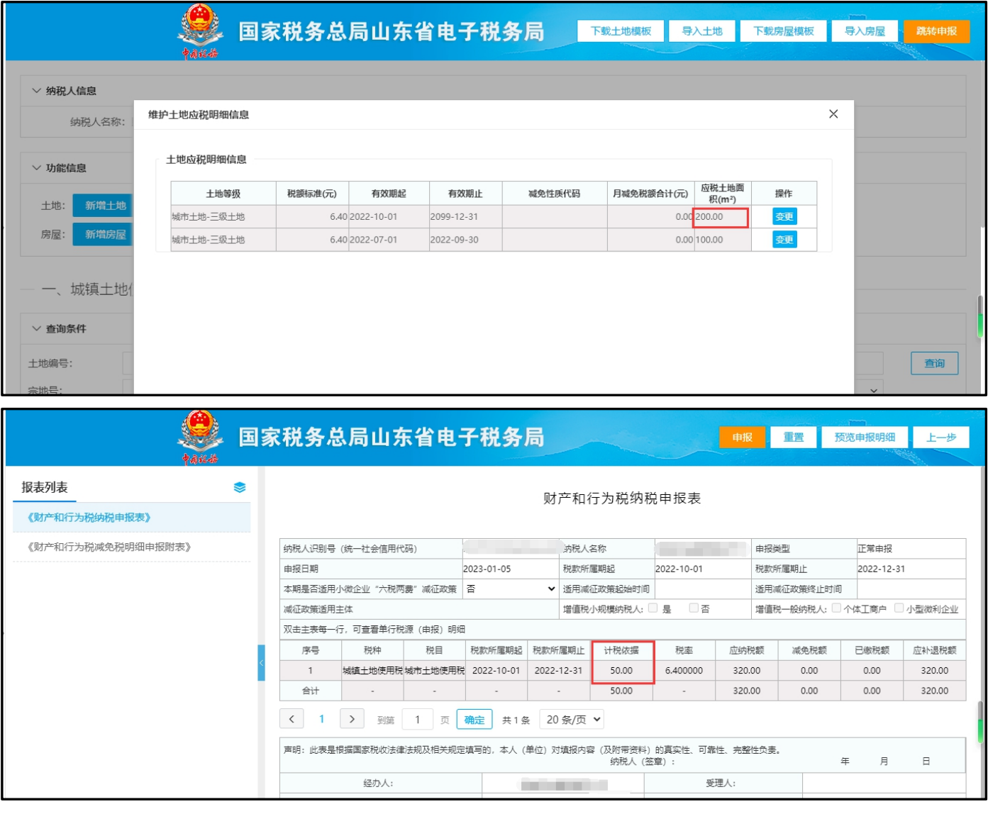 按季申报城镇土地使用税的,财产和行为税申报表中的“计税依据”等于“应税明细”中相应有效期的“应税土地面积”除以12再乘以3(本期申报的月份数)。您单位出现的情况是因仅修改了城镇土地使用税税源“基本信息”中的“土地总面积”,未修改“应税明细”中的“应税土地面积”。如下图所示: