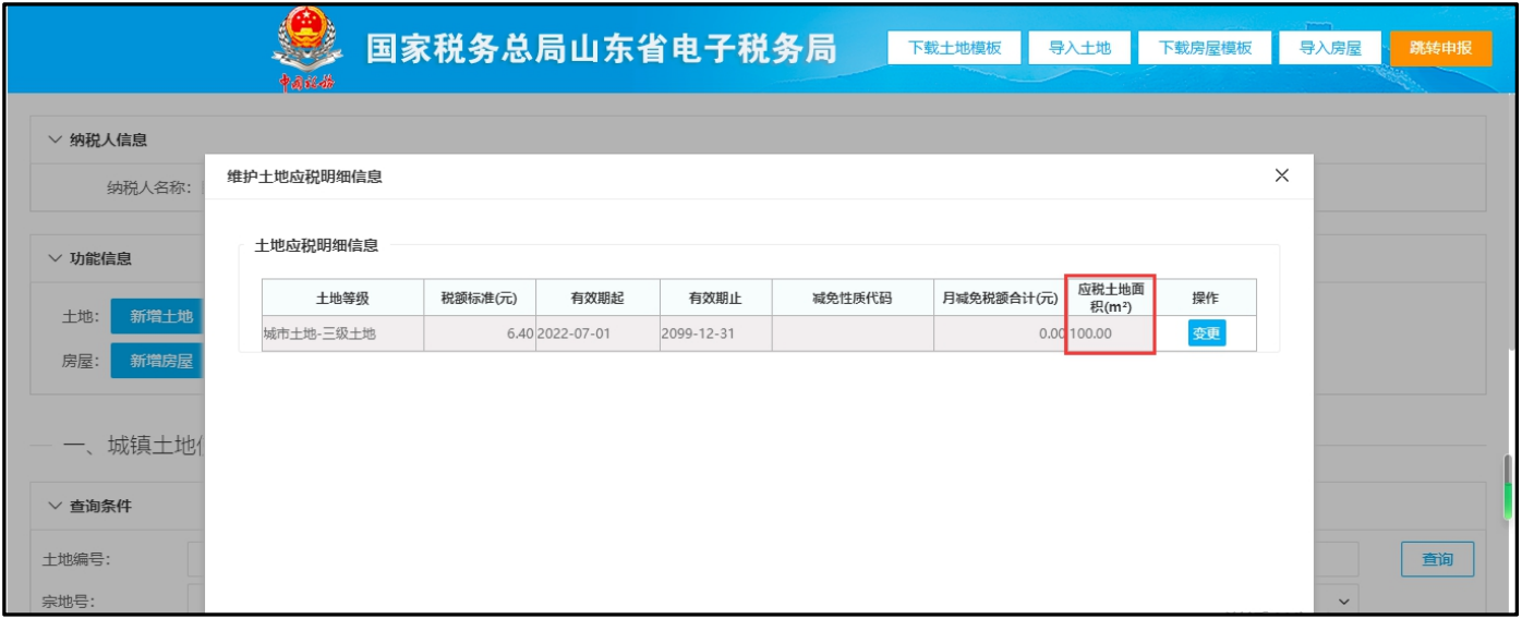 请打开土地应税明细,点击“变更”,先填变更时间为2022年9月30日(注意:变更时间为变更月份的上个月底),再进入申报页面时,计税依据就会调整为50平方米(即:200÷12×3=50),如下图所示: