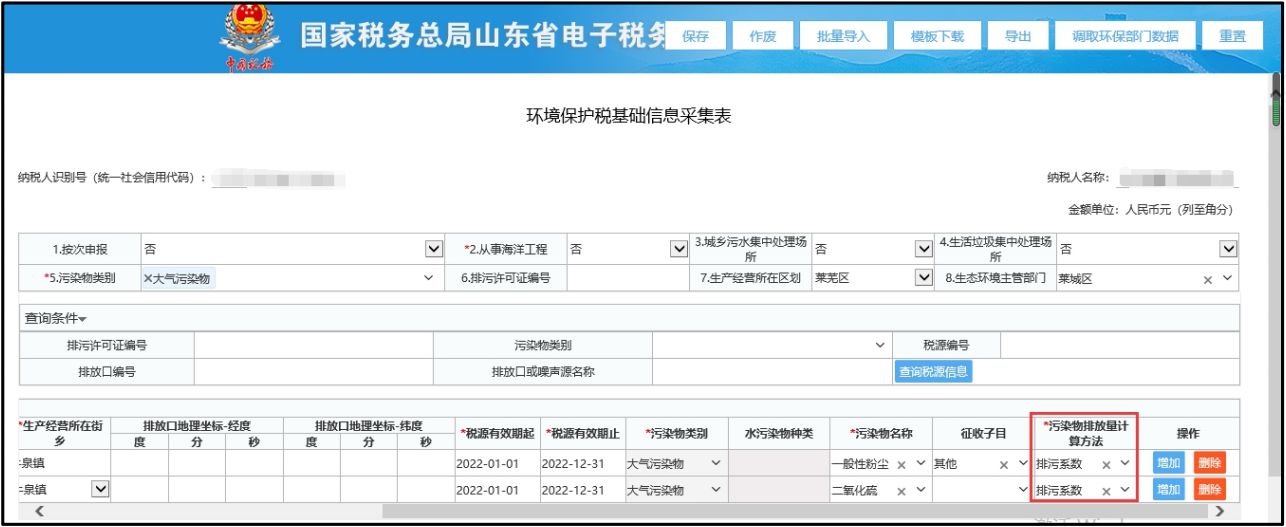 纳税人在“环境保护税基础信息采集表”中维护的“排污系数”是指选择的“污染物排放量计算方法”。