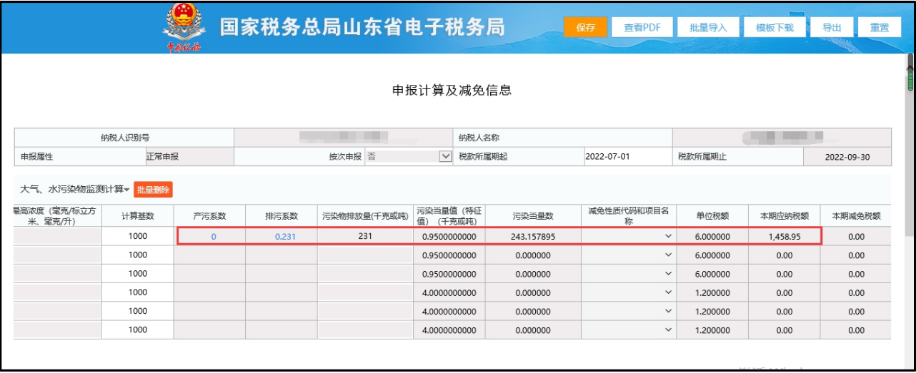 选中排污系数,点确定后,“污染当量数”和“本期应纳税额”将自动计算,如下图所示: