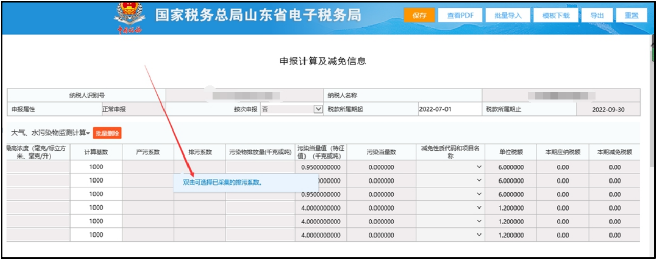 双击“排污系数”栏(鼠标移动到“排污系数”栏时,系统弹出操作提示),如下图所示: