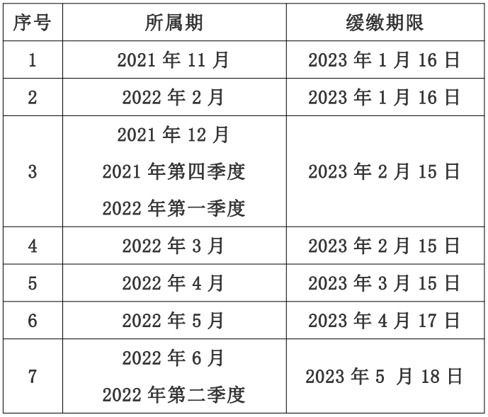 根据《国家税务总局 财政部关于制造业中小微企业继续延缓缴纳部分税费有关事项的公告》(国家税务总局 财政部公告2022年第17号),制造业中小微企业2021年11月所属期享受缓缴的税款,在2023年1月16日前缴纳。其他所属期已享受延缓缴纳税款的缓缴期限请参考下表: