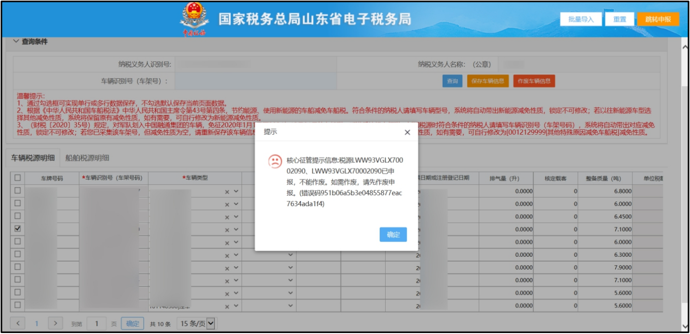 税源作废时,如系统检测到存在其他年度的申报信息,是不允许作废的。已报废无需继续申报的车辆,不需要作废税源信息,只需要做纳税义务中止即可,操作办法如下: