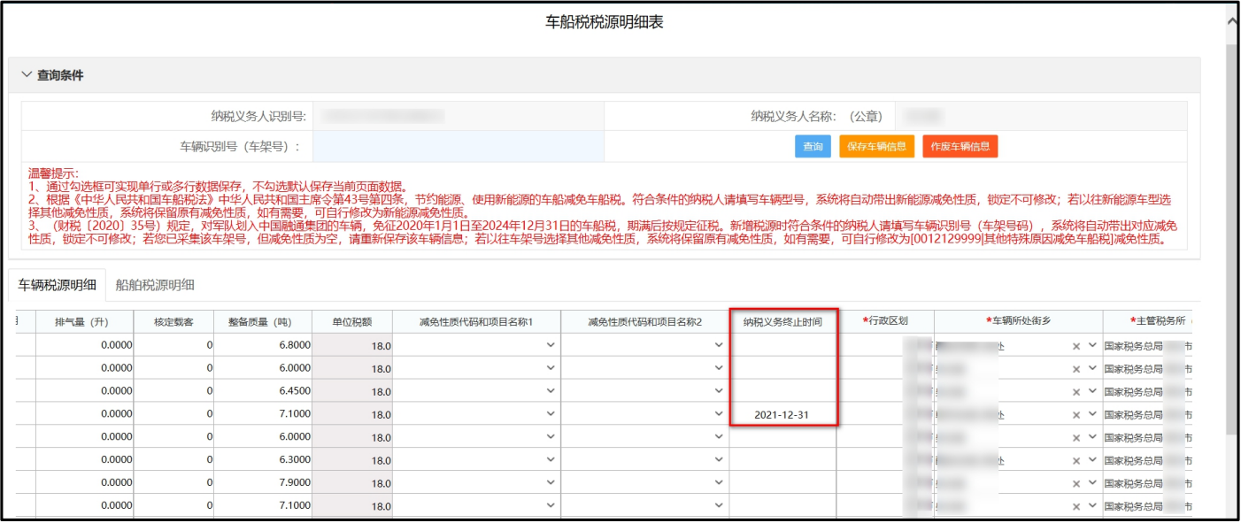 打开车船税税源明细表,勾选此车信息,填写“纳税义务中止时间”,如2022年已报废无需申报,“纳税义务中止时间”填写2021年12月31日,点击“保存车辆信息”即可。
