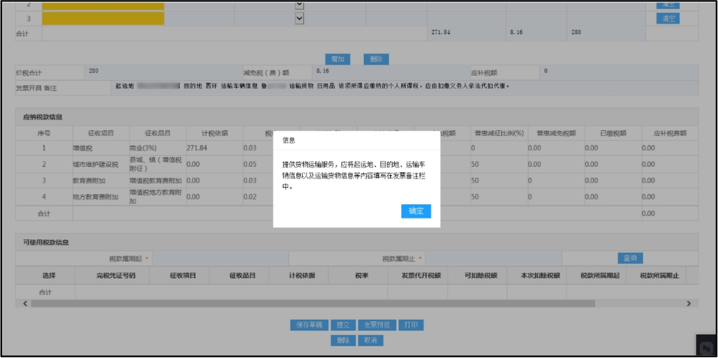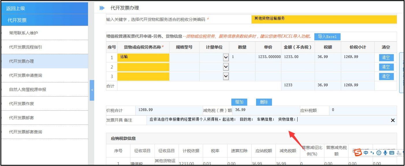 当您代开的货物或应税劳务名称为运输类时,系统自动带出备注信息的填写格式,请在系统自动带出的备注信息中补充起运地、目的地、车辆信息等相关内容,如下图所示:
