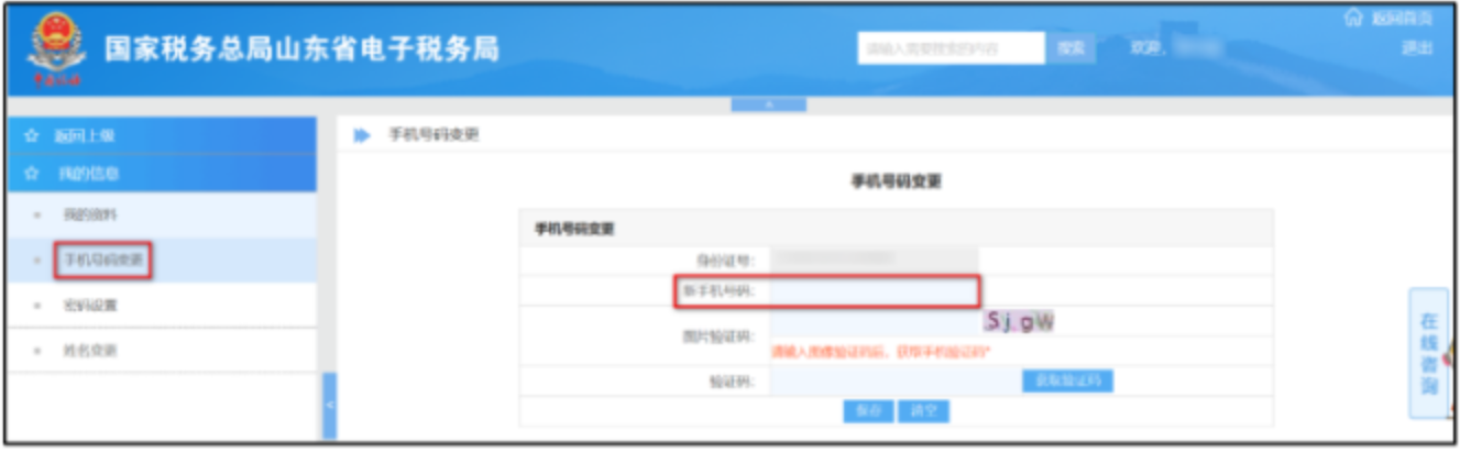 遇到此类问题,请您以自然人身份登录山东省电子税务局,通过“我的信息一手机号码变更”模块变更手机号码,如下图所示:
