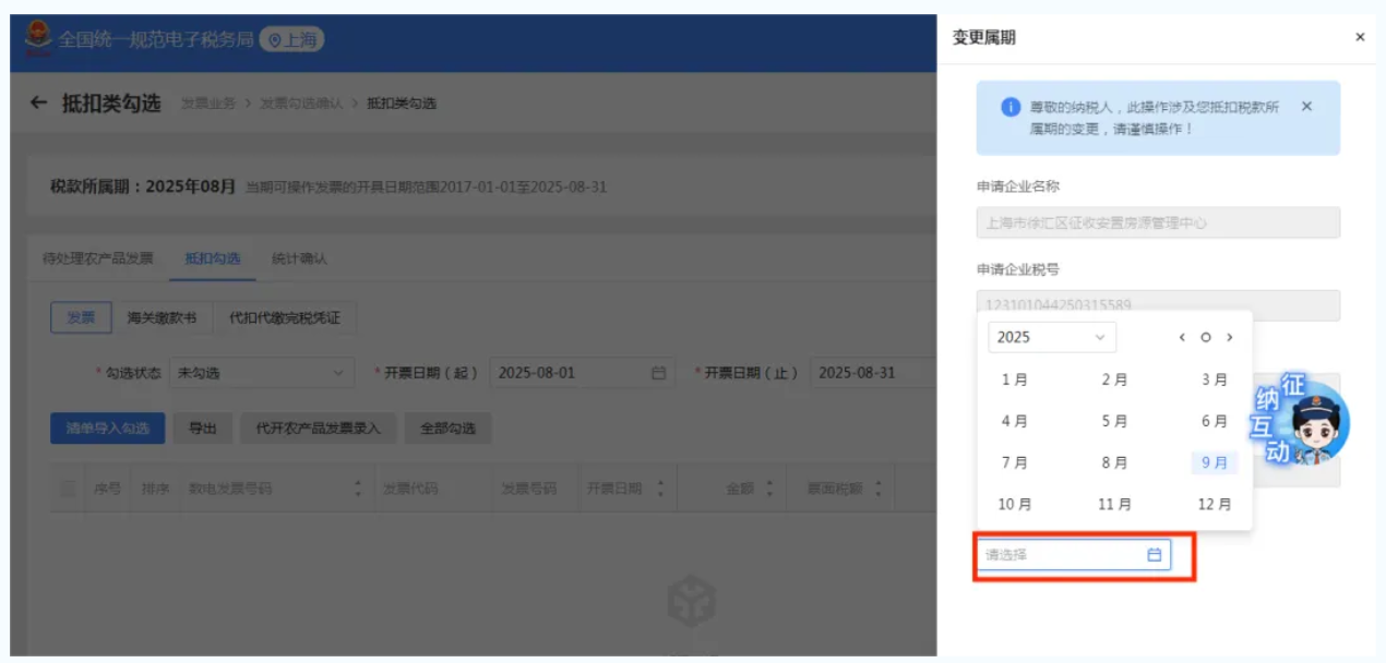4.点击提交后,弹框提示税款所属期变更,点击【确定】完成变更操作。完成回退税款所属期操作后,返回抵扣勾选界面就可以对当前所属期的进项发票重新勾选确认。