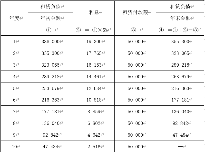 在租赁期开始日,A公司确认的租赁负债和使用权资产为386 000元 ,即50 000 ×(P/A, 5% , 10) =386 000 (元)。租赁负债将按下表所述方法进行后续计量。