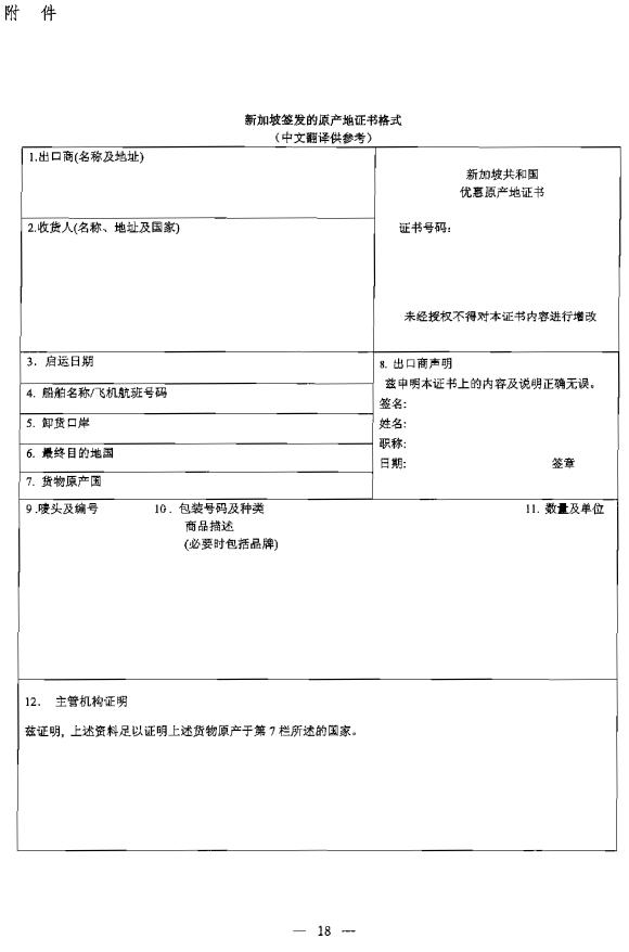 三、根据《中华人民共和国政府和新加坡共和国政府自由贸易协定》原产地规则的规定,当出口货物可视为原产于一方时,原产地证书应当在货物出口前或出口时签发。出口人或生产商应当提交签发原产地证书的书面申请,并随附相关证明文件,以证明出口货物符合原产地证书的签发要求。