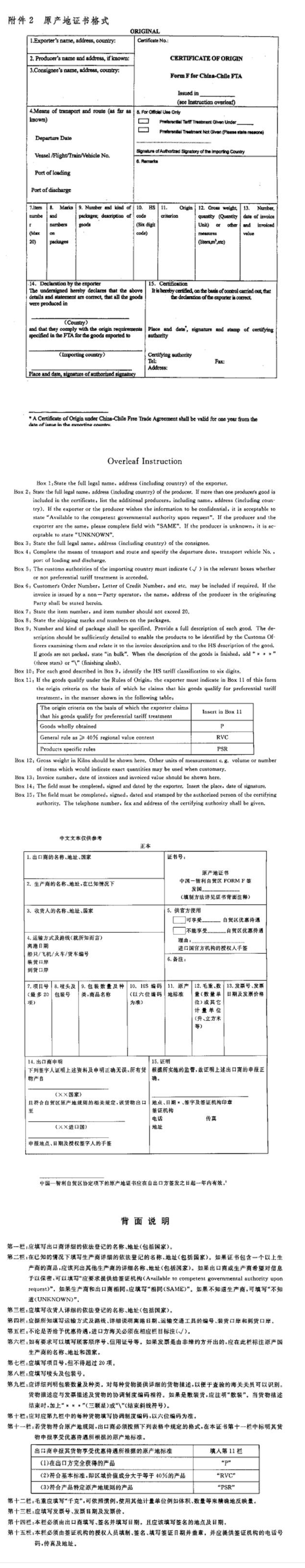 进口货物收货人向海关提交的智利原产地证书必须符合本办法附件2所列格式,所用文字应当为英文,并且加盖有“正本(ORIGINAL)”字样的印章。