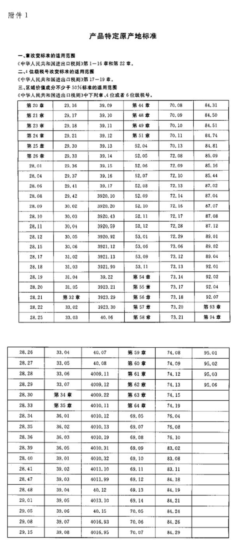第六条 从智利进口本办法附件1所列货物,符合“章改变标准”、“4位级税号改变标准”、“区域价值成分不少于50%标准”的,其原产地为智利。