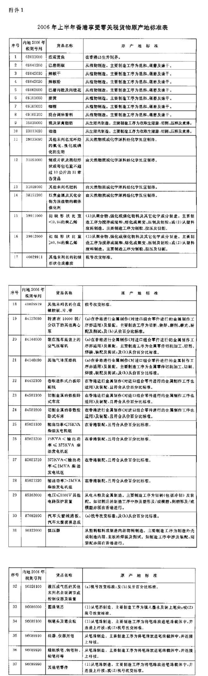 一、《2006年上半年香港享受零关税货物原产地标准表》和《2006年上半年澳门享受零关税货物原产地标准表》(以下简称《标准表》,见附件1、2)现予以公布,自2006年7月1日起执行。其中,除“汽车天窗的玻璃总成、汽车天窗的线路板”为具体列名,并按此列名执行外,《标准表》中所列其他商品使用了简化的货物名称,其范围与2006年《中华人民共和国进出口税则》中相应税号的货品一致。