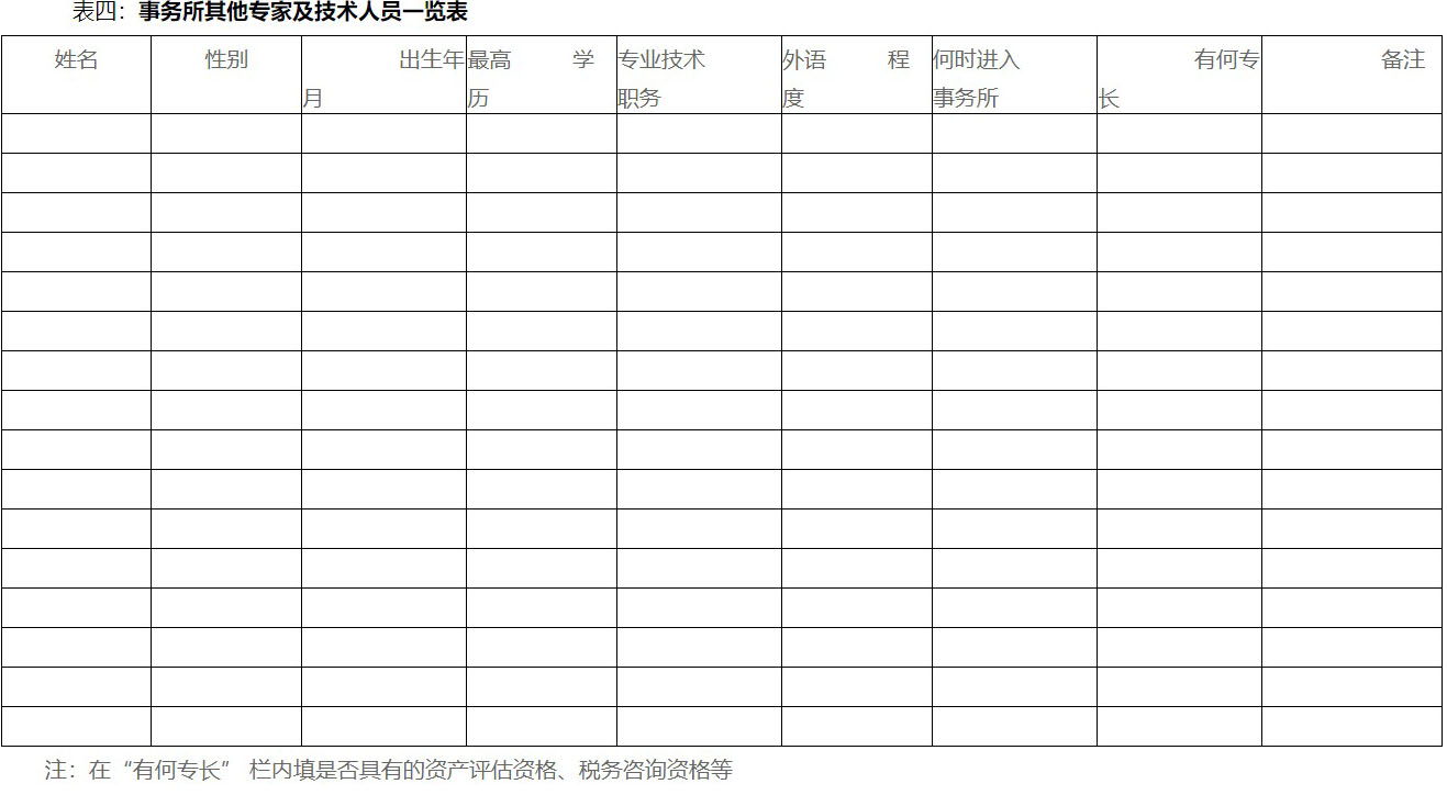(三)事务所填写的《事务所注册会计师一览表》、《事务所业务助理人员一览表》及《事务所聘用的其他专家和技术人员的情况表》;