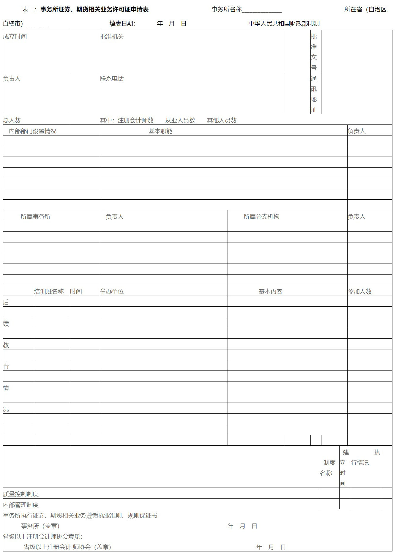 (一)事务所执行证券、期货相关业务的申请报告及《事务所证券、期货相关业务许可证申请表》;