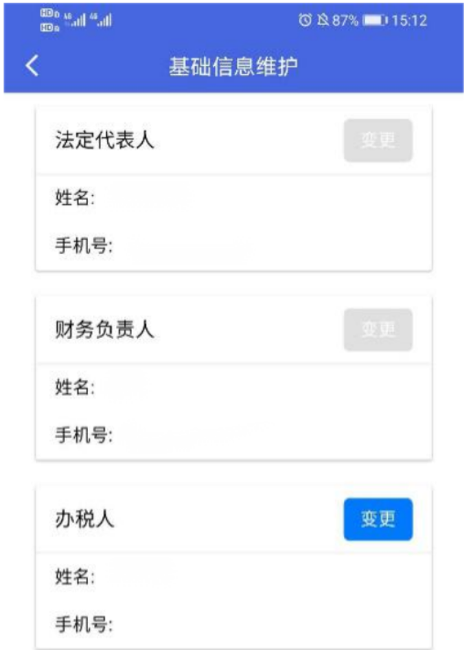 (1)进入江苏税务APP,在办税页面【综合信息】功能区,点击【基础信息维护】进入操作界面。(法定代表人可维护本人手机号码、财务负责人及办税人员信息;财务负责人可维护财务负责人及办税人员信息;办税人员可维护办税人员信息。)