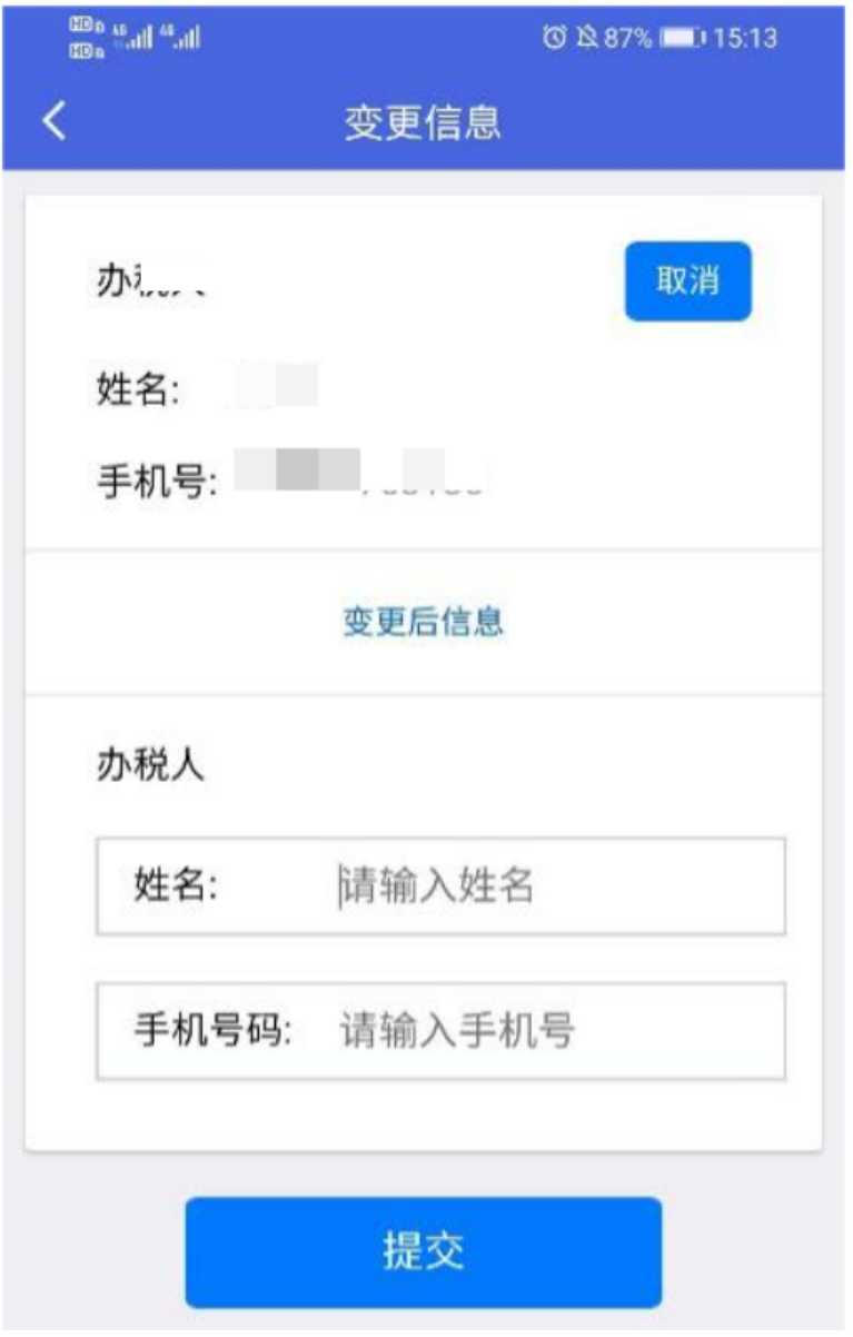 (3)纳税人根据提示填写更改信息,点击【取消】可返回上一级重新选择,点击【提交】则提交成功。