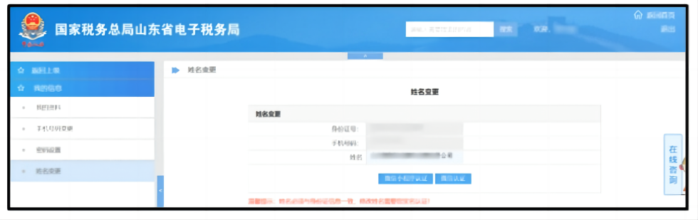 可以。遇到此类情况,您可通过电子税务局“我的信息一我的资料一姓名变更”模块,修改姓名信息,如下图所示: