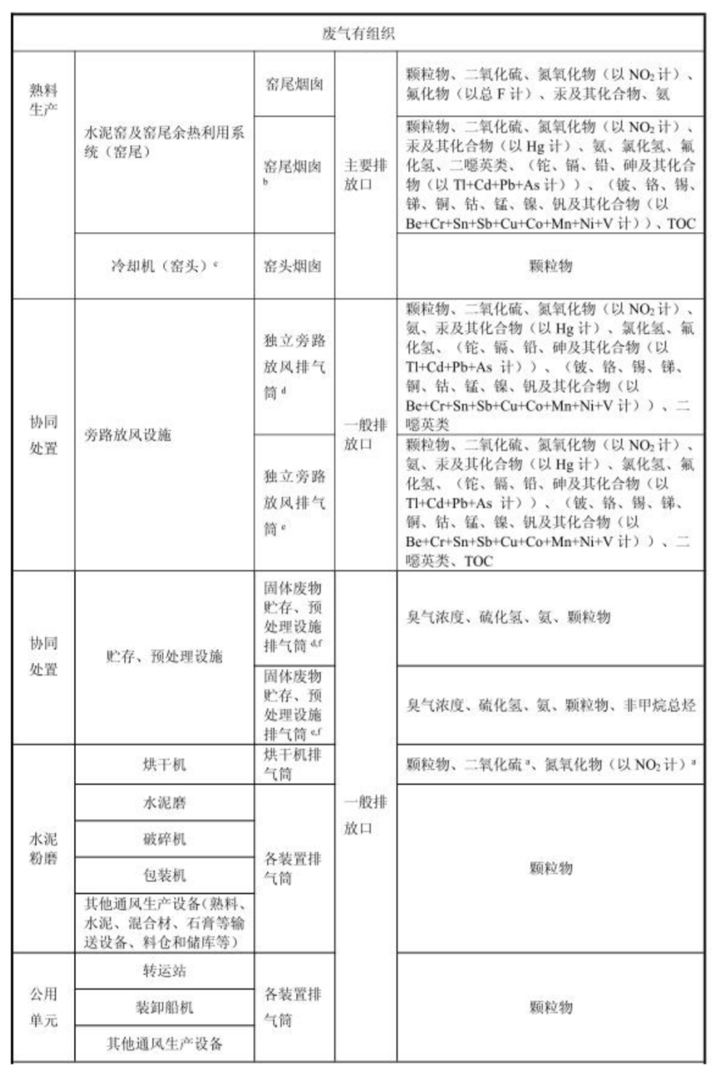 水泥生产企业废气排放口主要包括水泥窑及窑尾余热利用系统、冷却机、煤磨、水泥磨、烘干机(磨)、包装机等生产设施对应的烟囱或排气筒。分为有组织排放和无组织排放。其中有组织排放分为主要排放口和一般排放口两种情况。