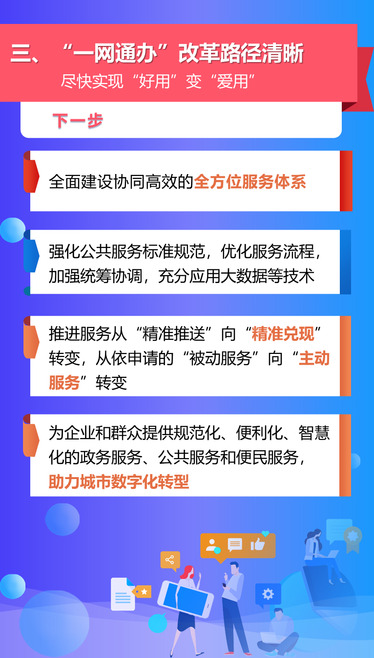 聚焦群众和企业普遍关注、需求集中的领域,以使用者感受为导向,优化服务流程,提升服务实效,把用户体验作为衡量服务质量的唯一标准,推进服务“有求必应、无事不扰”,服务绩效由群众和企业评判。过去三年,主要解决了“一网通办”中的“一网”,从今年开始更大的改革是“通办”,如果说进“一网”是物理变化的话,能“通办”一定要产生化学反应。